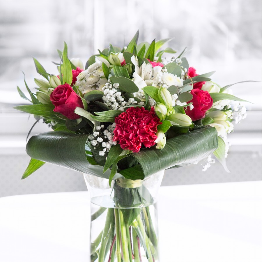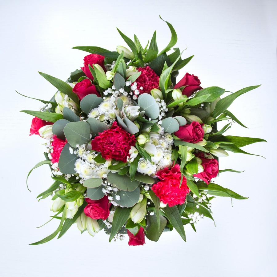 Embrace the delightful charm of our bouquet, featuring luxurious red roses, pure white chrysanthemums, and vibrant carnations. Complemented by gypsophila and aspidistra leaves, this arrangement is a perfect blend of beauty and uniqueness.