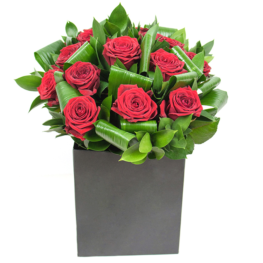 Embrace the beauty and elegance of our stunning bouquet, featuring passionate red roses, vibrant aspidistra leaves, and elegant ruscus. This unique design enhances any environment with its rich colors and sophisticated charm.